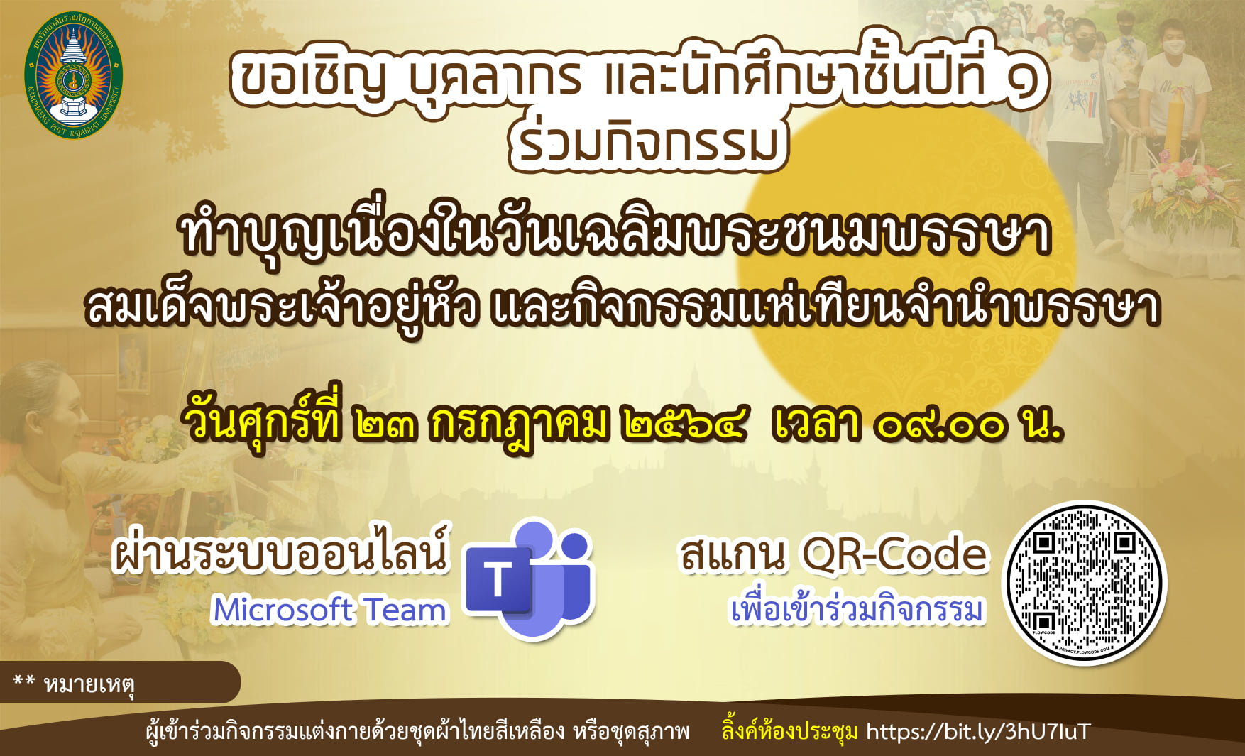 ในการนี้ฝ่ายศิลปะและวัฒนธรรม มหาวิทยาลัยราชภัฏกำแพงเพชร แม่สอด จึงขอเชิญท่านเข้าร่วมพิธีทำบุญเนื่องในวันเฉลิมพระชนมพรรษา พระบาทสมเด็จพระปรเมนทรรามาธิบดีศรีสินทรมหาวชิราลงกรณ์พระวชิรเกล้าเจ้าอยู่หัว และกิจกรรมแห่เทียนจำนำพรรษา ในวันที่ 23 กรกฎาคม 2564 ผ่านระบบออนไลน์ Microsoft Teams โดยสามารถเข้าถึงได้จาก